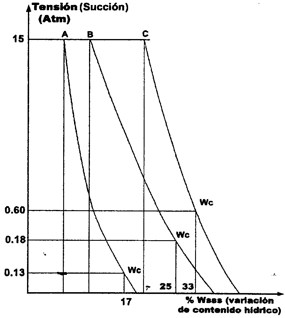 Conocidas las características del suelo y del agua, su relación se visualiza en las denominadas curvas de capacidad hídrica. En la figura 2.1, se observa la variación del contenido hídrico versus la tensión con la cual está retenida el agua. Además permite ilustrar otros aspectos ligados al estudio e interpretación de la relación suelo-agua-planta. La capacidad de campo, WC, es el contenido hídrico que presenta un suelo cuando partiendo de un estado de saturación, drena el agua gravitacional en un período que varía según su textura (24-36 horas en suelo arenoso, 40-50 horas en franco y 72 horas en arcilloso).