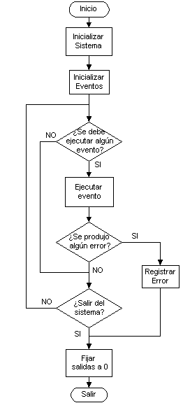 Al empezar, primero se inicializa el sistema, luego ocurre lo mismo con los eventos los eventos y se empieza a ejecutar el bucle principal que verifica cuando se debe ejecutar cada evento y si se produce algún error al procesarlo. Por último se verifica si no se quiere salir del sistema. En caso de producirse algún error se sale del sistema registrando de que tipo de error se trata y la fecha y hora a la que se produjo. Antes de salir del sistema se aseguran que todas las salidas se anulen (es decir que todos los relés estén en estado normal).